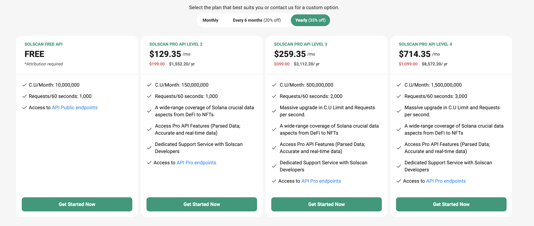 You can view all of the detaileds Solscan Pro API levels [HERE](https://solscan.io/apis) or contact us at <support@solscan.io> to register.
